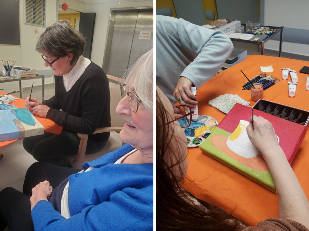 Agnès Rainjonneau, artiste peintre, accompagne les résidents et leur propose d’être leur main pour réaliser un tableau personnalisé qu’ils exposeront dans leur chambre.