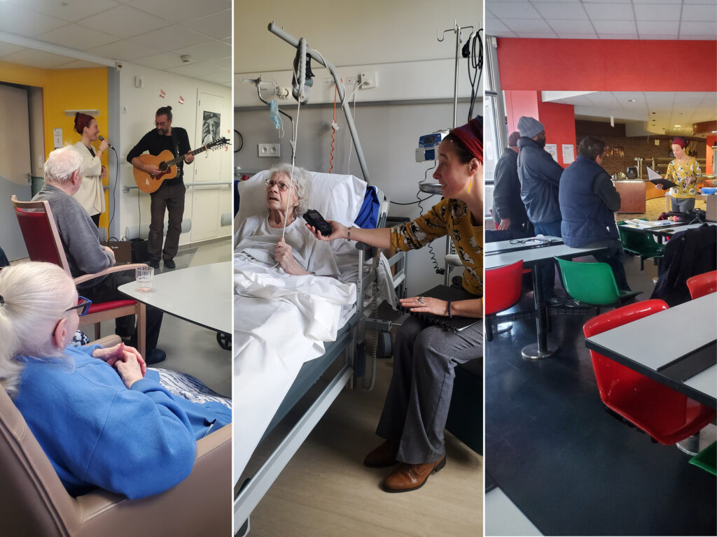 La compagnie « où sort le soleil » a pu échanger avec les patients du service de cancérologie, les résidents de Léonard de Vinci ainsi que le service distribution de la restauration pour imaginer un monde meilleur en chanson.
